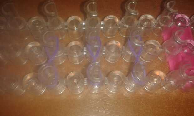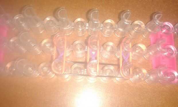 En primer lugar, tenemos las fuentes para la pulsera.Usted necesitará lo siguiente:Un telar, un gancho que se avecina, un montón de bandas y un clip de c, s u o.Paso 1: Poner las bandas en el telar Tomar dos bandas de telar y ponerlos juntos en la mi