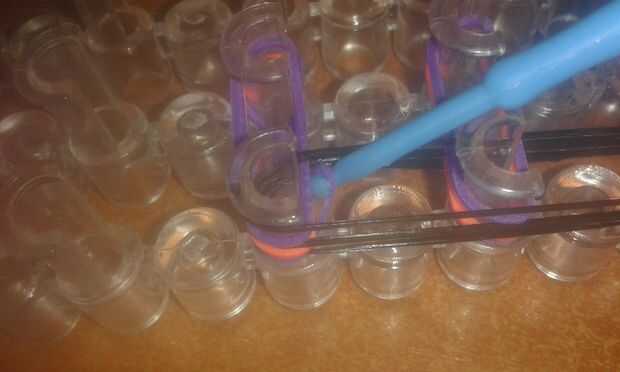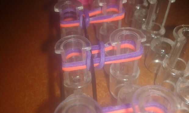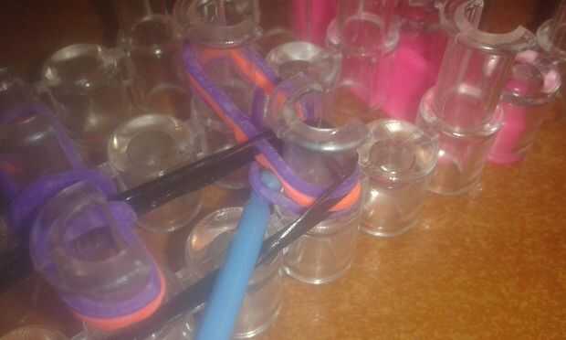 En primer lugar, tenemos las fuentes para la pulsera.Usted necesitará lo siguiente:Un telar, un gancho que se avecina, un montón de bandas y un clip de c, s u o.Paso 1: Poner las bandas en el telar Tomar dos bandas de telar y ponerlos juntos en la mi