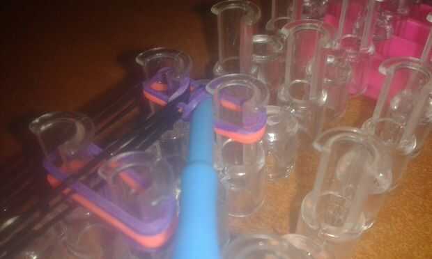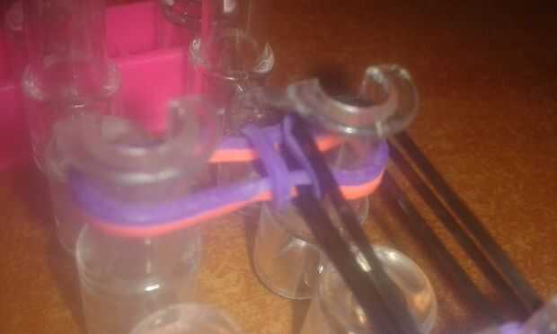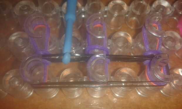 por favor como y seguir!!!!!! Asegúrese de que el telar se parece a las fotos!Paso 1: materiales Se necesita:Un telarUn gancho deBandas del arco irisClips dePaso 2: Comenzar con un telar En el telar, lugar de su primera banda de caucho diagonalmente
