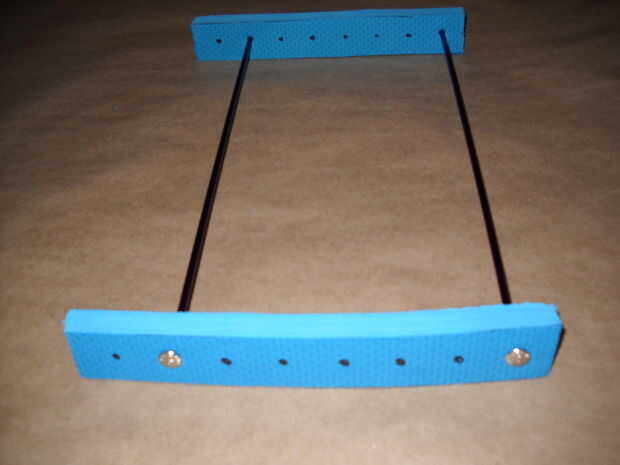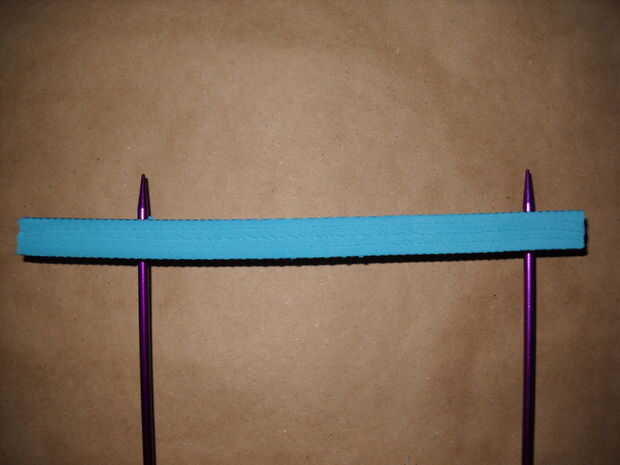 Ahora puede insertar las agujas de tejer a través de cualquiera de los orificios y en los agujeros correspondientes en la segunda franja--manteniendo una tira de espuma en la base de las agujas y la otra tira de espuma cerca de las puntas de las agujas.