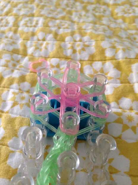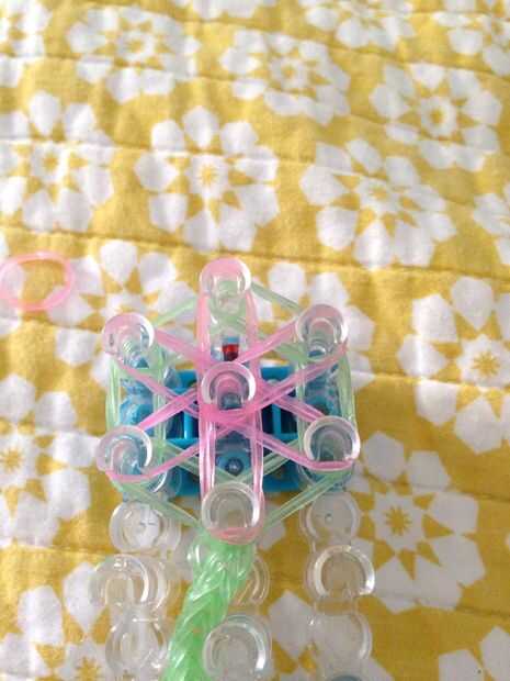Paso 1: materiales Telar del arco irisBandasGanchoPaso 2: Colocación de bandas Tomar una banda primero ir de media peg a enfrente de él. Luego tomar dos bandas y hacer lo mismo en la fotografía. Ir de media ped en la clavija correcta diagonaly, hacer