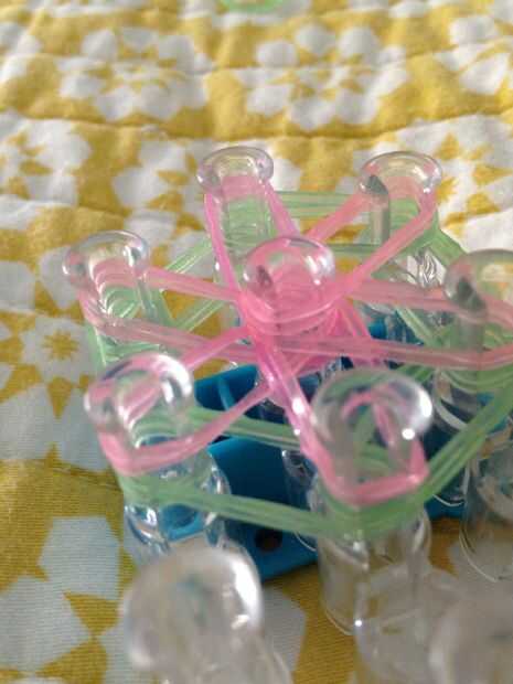 Ahora, con un nuevo color, toma doble bandas y colocarlos como se muestra en una dirección hacia la izquierda. Luego Envuelva una única banda alrededor de la clavija central tres veces, creando cuatro bucles. Esta es la segunda capa
