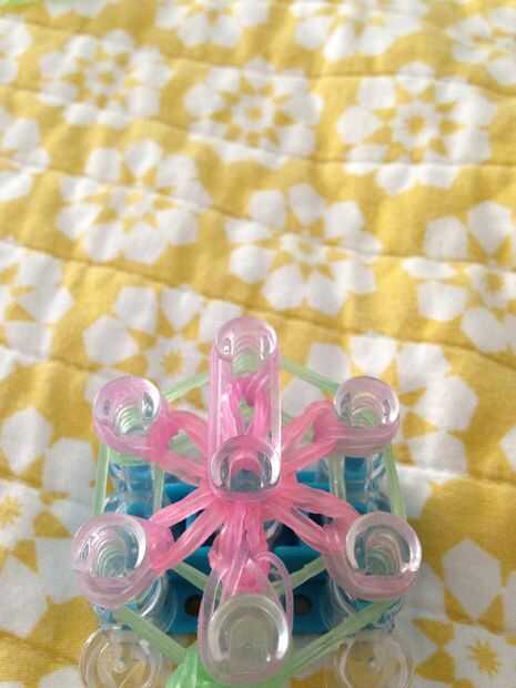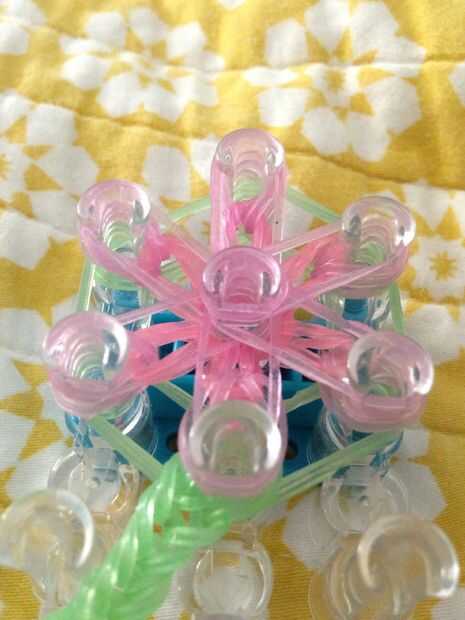Ahora es el momento para agregar la tercera capa. Empuje hacia abajo de todas sus bandas, porque es el momento de añadir algunas bandas más! Usando bandas individuales, coloque en sentido antihorario como se muestra. Luego, utilizando una única banda, envuélvalo alrededor de tres veces, creando cuatro bucles.