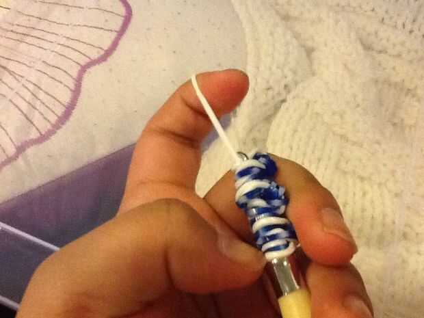 Casi hecho! Debe tener 1 b-banda izquierda. Poner esa banda b en el extremo del gancho y deslice todos los cachitos de telar. Poner ambos extremos de la banda b en el gancho y termine con un nudo del resbalón.