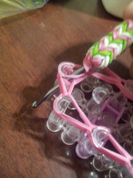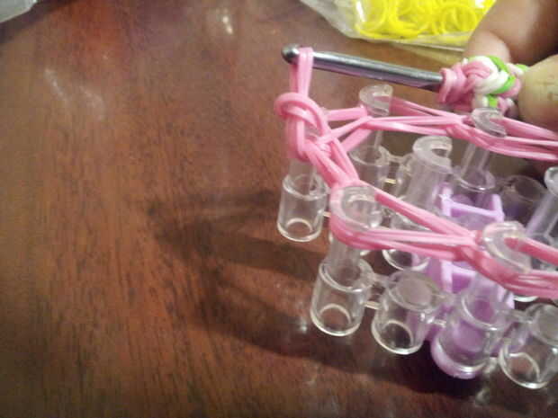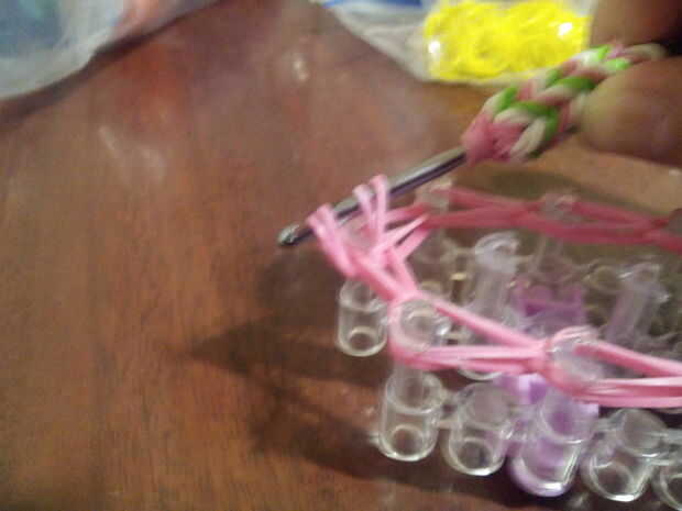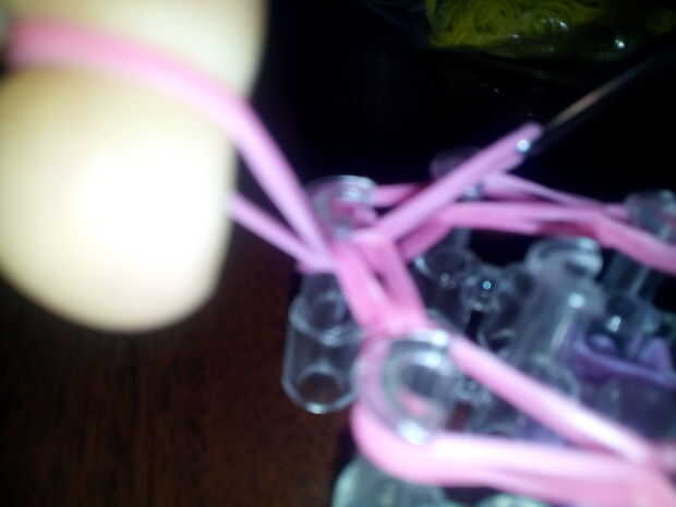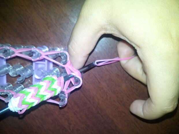 1.Put el gancho a través de todas las bandas de goma como se muestra en la primera foto
