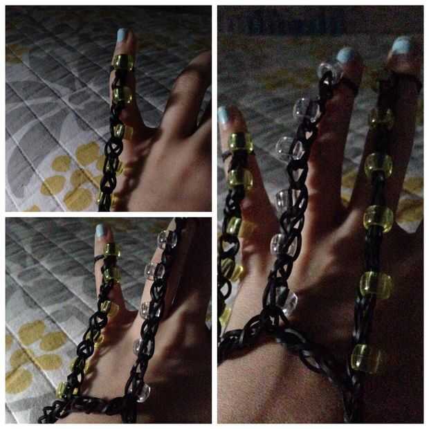 Primera vez poner un clip de s o c-clip en el extremo de la parte de la muñeca. Luego, tomar la cosa entera apagado el telar y una los extremos juntos. Para poner en la mano, poner en la parte de la muñeca y poner la banda de la tapa en el extremo de cada dedo alrededor de la punta de su dedo.