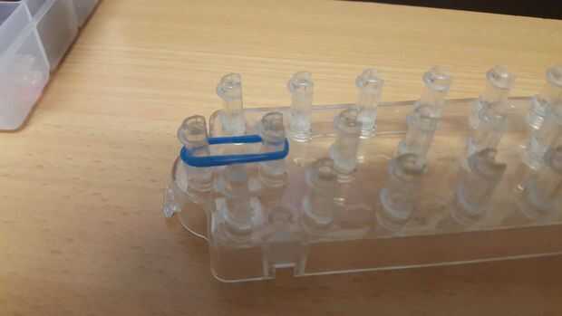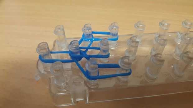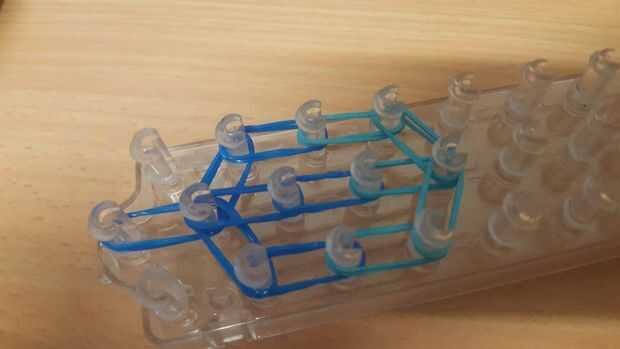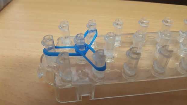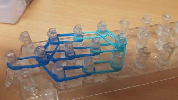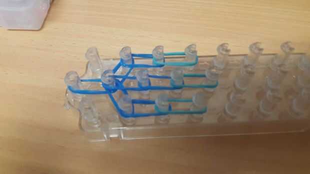 • Tomando 2 bandas de colocarlos en la parte superior de su telar, las 2 primeras clavijas