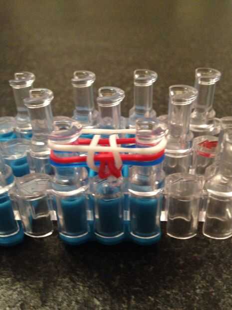 he modificado este video tutorial para crear una pulsera bigote! ¡ Disfrute!Paso 1: Se necesita: una tira de las clavijas de un telar del arco iris, dos colores de bandas (mina son de color rojo para las bandas de encuadre y plata para las bandas de