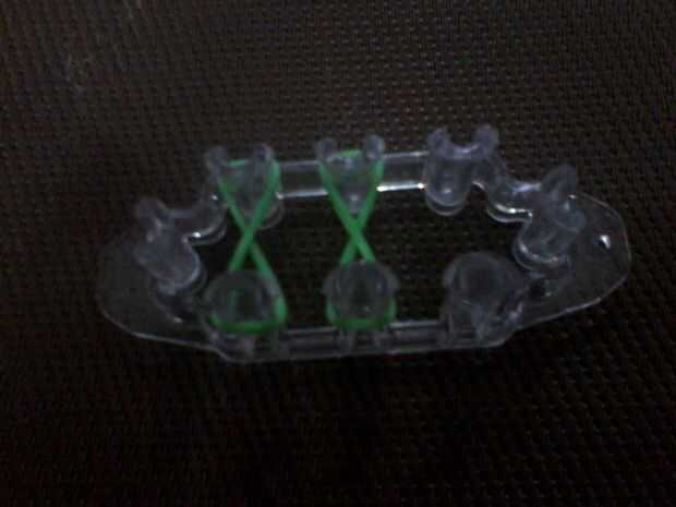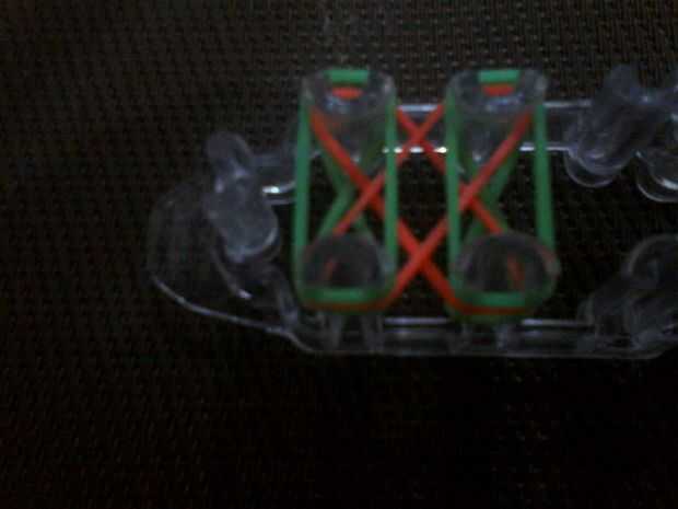= > En primer lugar, agregue dos bandas del mismo color en cualquier dos clavijas (verticalmente) de la misma de un ocho o en el mundo moderno, infinito.