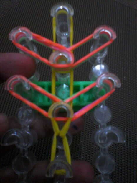 necesita: bandas de un telar del arco iris, un gancho y blanco y negro.Paso 1: Colocación de las bandas Lugar sus bandas en un principio como el triple solo paren en la clavija 4 y mover la banda hacia la derecha y luego haces una línea recta en el c