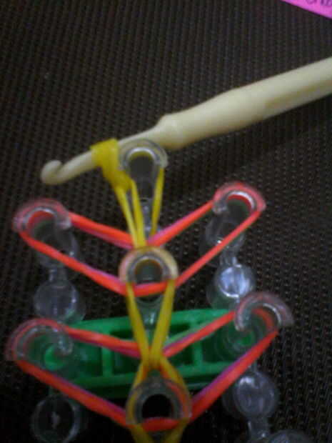 Empuje el gancho a través de la primera clavija de bandas de la fila del medio.