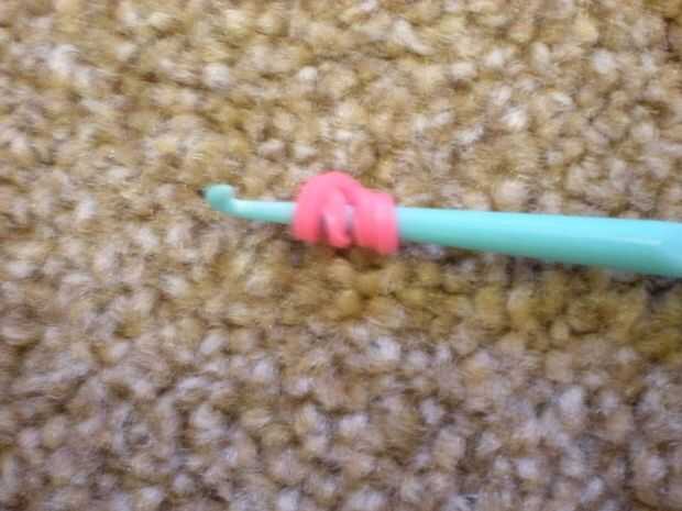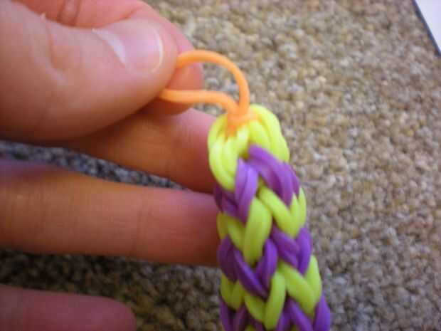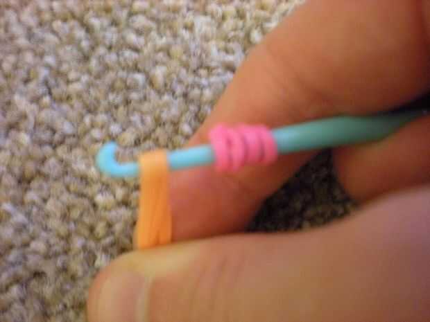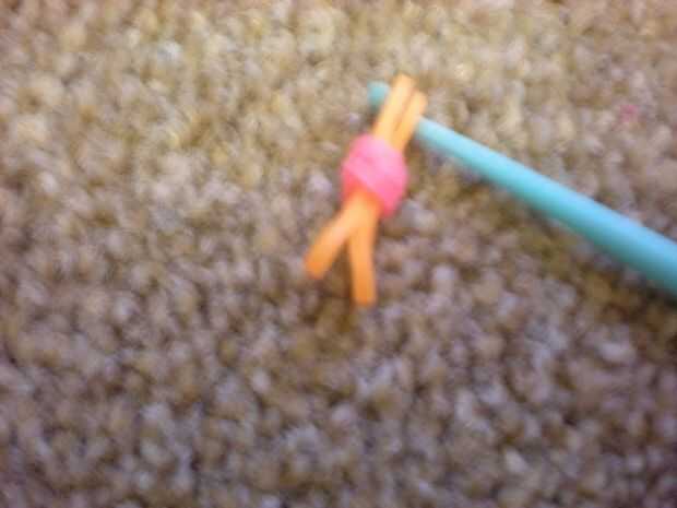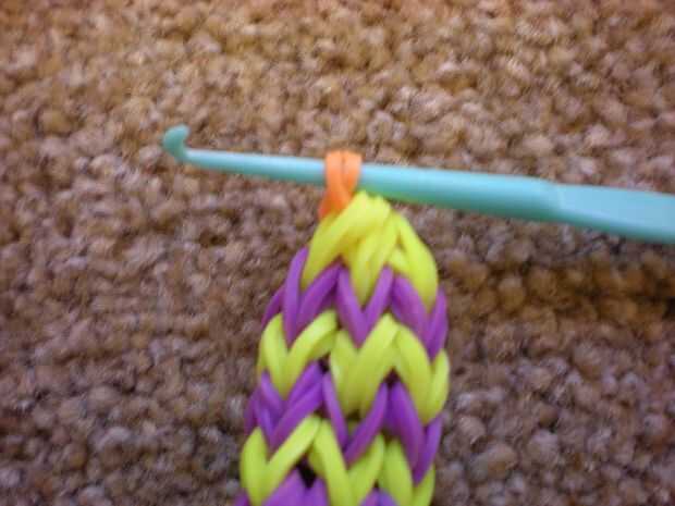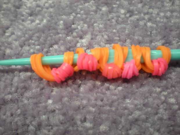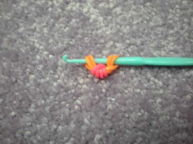 Conseguir el final del color del pétalo y lazo alrededor del gancho del cuatro veces. Poner dos bandas naranja en el gancho y deslice la banda rosa a él. Las dos bandas naranja hacia atrás en el gancho del lazo y empuje a lo largo del gancho. Repita esto hasta que tenga cinco pétalos.
