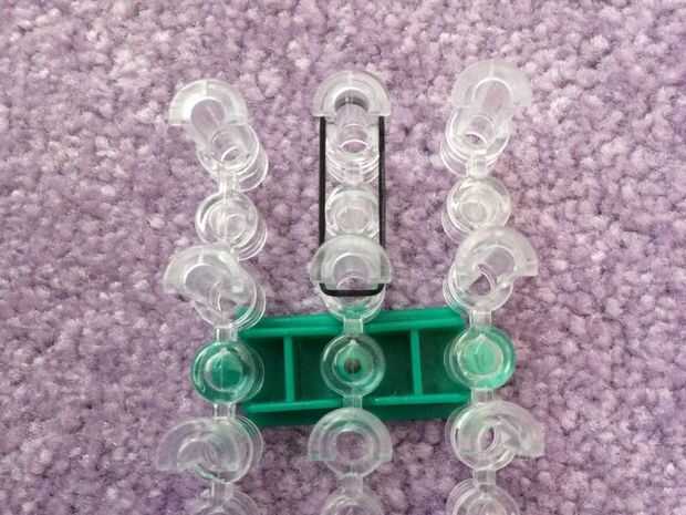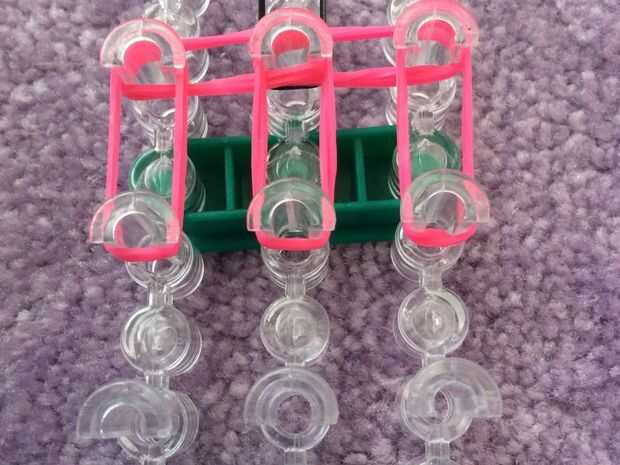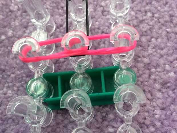 Coloque una sola banda de caucho negro en la parte superior de su telar. Luego colocando dos bandas a la vez, como en la foto del lugar.