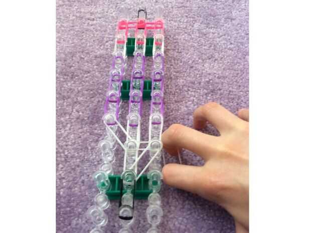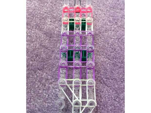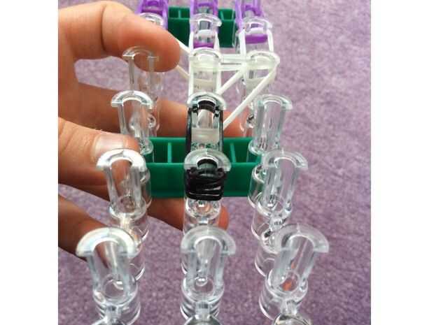necesita: bandas de un telar del arco iris, un gancho y blanco y negro.Paso 1: Colocación de las bandas Lugar sus bandas en un principio como el triple solo paren en la clavija 4 y mover la banda hacia la derecha y luego haces una línea recta en el c