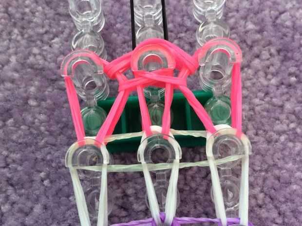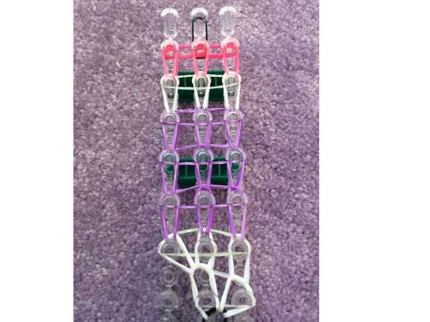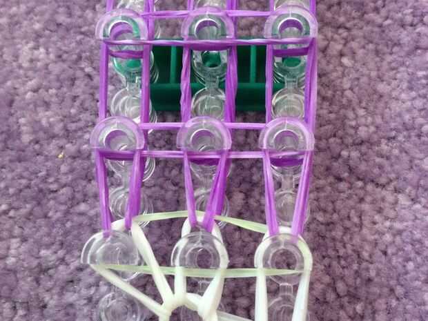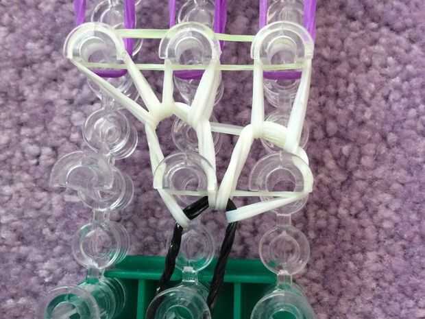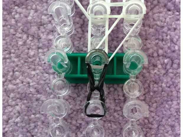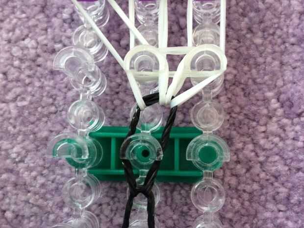 necesita: bandas de un telar del arco iris, un gancho y blanco y negro.Paso 1: Colocación de las bandas Lugar sus bandas en un principio como el triple solo paren en la clavija 4 y mover la banda hacia la derecha y luego haces una línea recta en el c