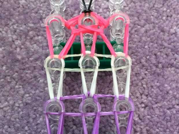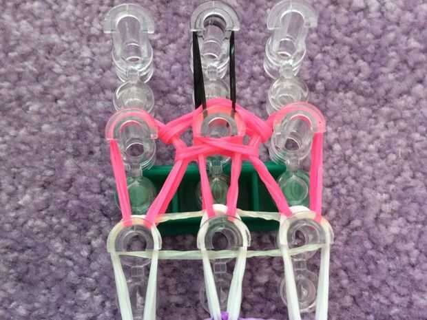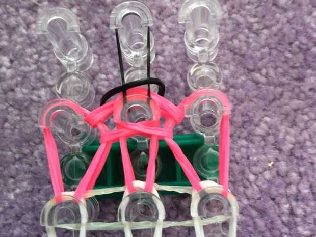 Llegar debajo de todas las bandas de color de rosa y recoger la banda negra, enganche sobre. Luego coge el inferior y lazo sobre por lo que parece la segunda foto. Luego jale la banda la clavija para apretarlo. Luego tire de ella.