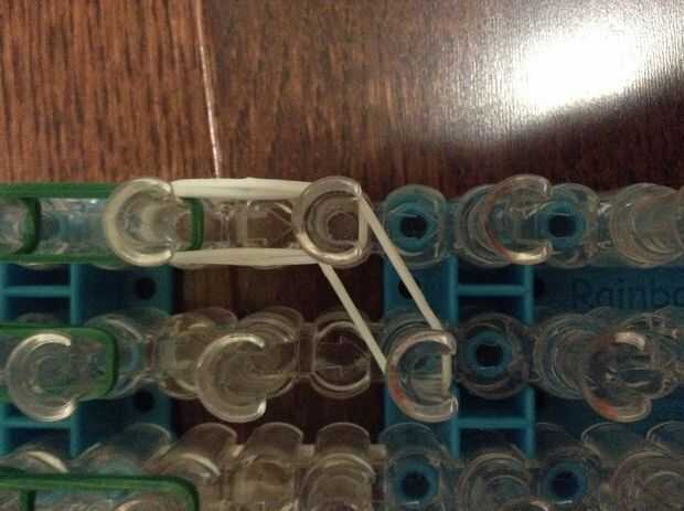 1: queremos hacer el interior helado parte tan ir a la derecha de su telar y agarrar dos bandas solo y colocarlos debajo el color principal entonces agarrar otro dos bandas y van desde los dos blancos solo colocaste e ir diagonal al igual que la imagen. (Lo siento mis fallos de cámara y perdió las otras imágenes para este paso lo siento sobre eso)