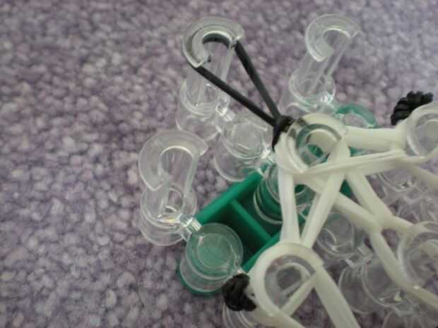 necesita: bandas de un telar del arco iris, un gancho y blanco y negro.Paso 1: Colocación de las bandas Lugar sus bandas en un principio como el triple solo paren en la clavija 4 y mover la banda hacia la derecha y luego haces una línea recta en el c