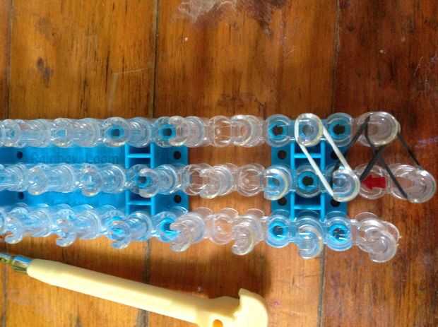 esto es una pulsera de nivel intermediaria, se puede hacer muy fácilmente.Fuentes: 3 colores de bandas en telar, telar del arco iris y un gancho.Paso 1: Empezar por colocar dos bandas blancas en forma de 'v' en el inicio del telar.Paso 2: El lugar un