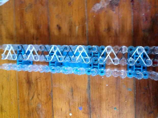poner una banda de caucho roja diagonal a su derecha e izquierda como se muestra en la imagen.Paso 1: Poner una goma roja y diagonalmente a la derecha e izquierda como se muestra en la imagen.Paso 2: Poner una goma turquesa en el delantero izquierdo.