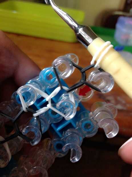 esto es una pulsera de nivel intermediaria, se puede hacer muy fácilmente.Fuentes: 3 colores de bandas en telar, telar del arco iris y un gancho.Paso 1: Empezar por colocar dos bandas blancas en forma de 'v' en el inicio del telar.Paso 2: El lugar un