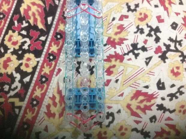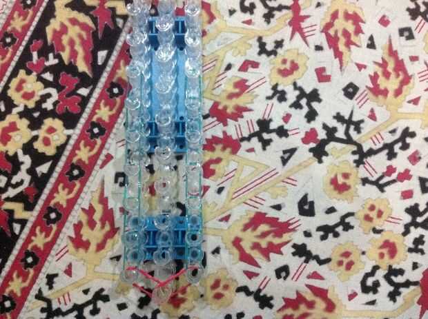 Continúe hasta que la clavija séptimo. Luego, poner diagonalmente dos bandas de goma rojos en la clavija media.