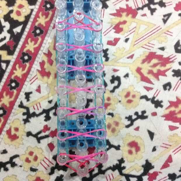 Pulsera única de telar del arco irisPaso 1:Coloque una banda roja en el telar.Paso 2:Luego, colocar una banda amarilla en la dirección opuesta.Paso 3:Continuar ese proceso en el orden del color del arco iris. Pare en el color de rosa.Paso 4:Luego agr
