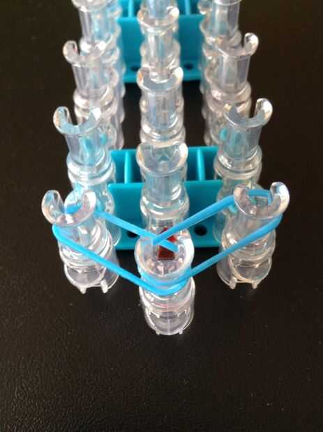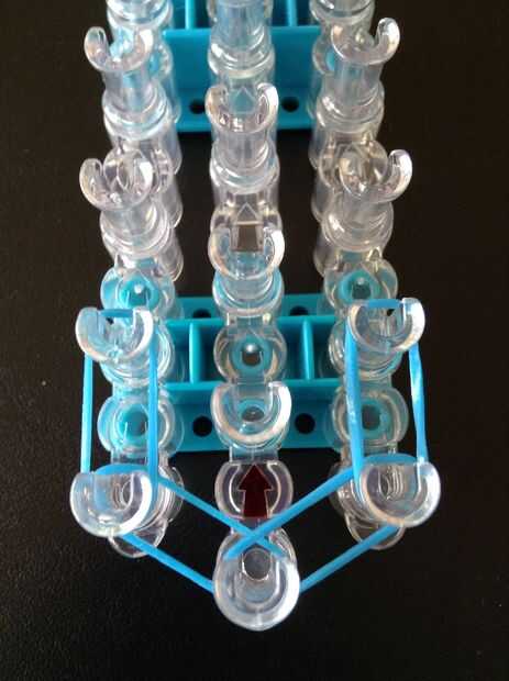 Tomar su primer color y el lugar desde el centro de la clavija hacia fuera a las clavijas de izquierda y derecha. Ahora toma el mismo color y colocar en la clavija izquierda exterior. Lo mismo en el lado derecho. Entonces tome su color exterior y coloque hacia arriba en ambas clavijas exterior. No olvide bajar las bandas!