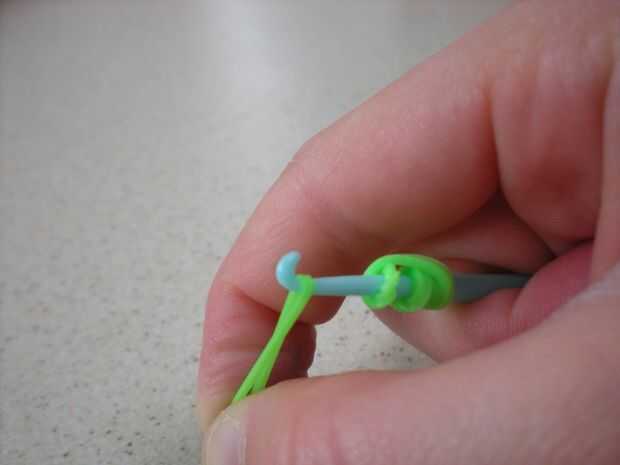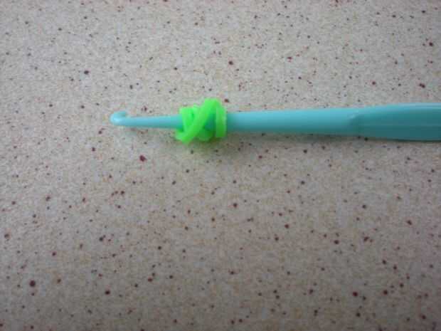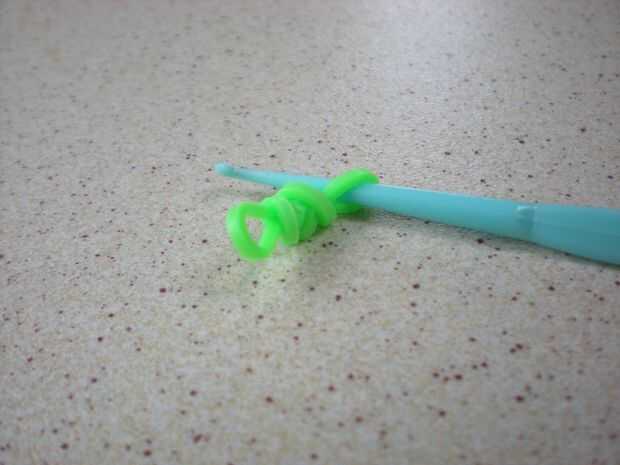 Para la cola Haz una banda y gire alrededor del gancho del crochet cuatro veces. Una banda en el extremo del gancho del lazo y deslice la banda retorcida sobre el gancho y a la banda. Luego el lazo detrás alrededor. Lazo de ambas bandas en el extremo de la cáscara y colocar una banda de la tapa en la parte superior, doble trenzado.