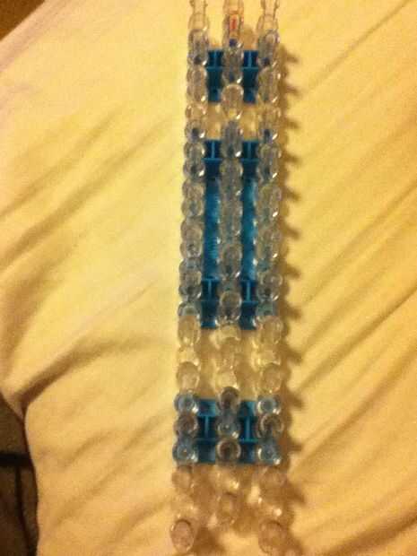 necesita: bandas de un telar del arco iris, un gancho y blanco y negro.Paso 1: Colocación de las bandas Lugar sus bandas en un principio como el triple solo paren en la clavija 4 y mover la banda hacia la derecha y luego haces una línea recta en el c