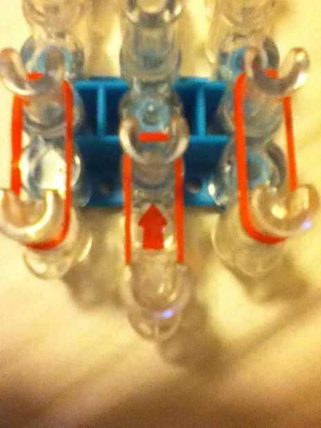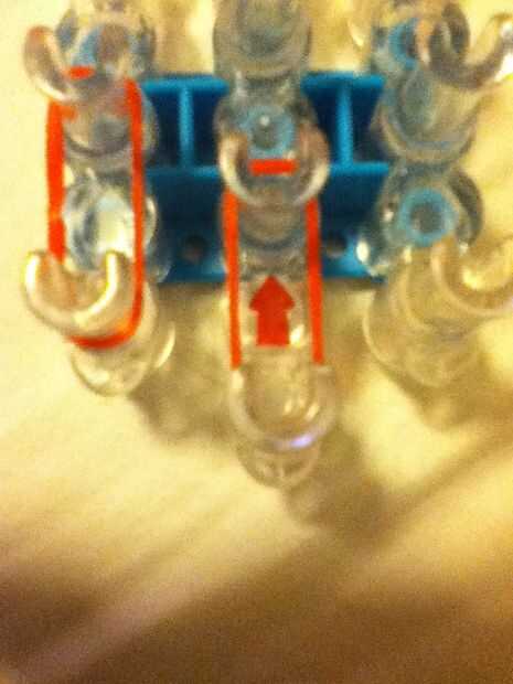 Toma una banda de color y toma de la clavija de la parte inferior y estirar hasta el beg justo encima de él. Lo mismo en todas las clavijas de la parte inferior.
