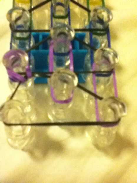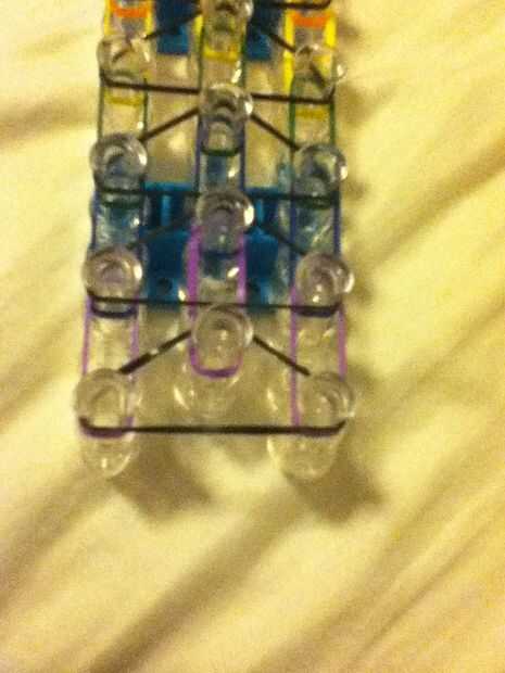 necesita: bandas de un telar del arco iris, un gancho y blanco y negro.Paso 1: Colocación de las bandas Lugar sus bandas en un principio como el triple solo paren en la clavija 4 y mover la banda hacia la derecha y luego haces una línea recta en el c