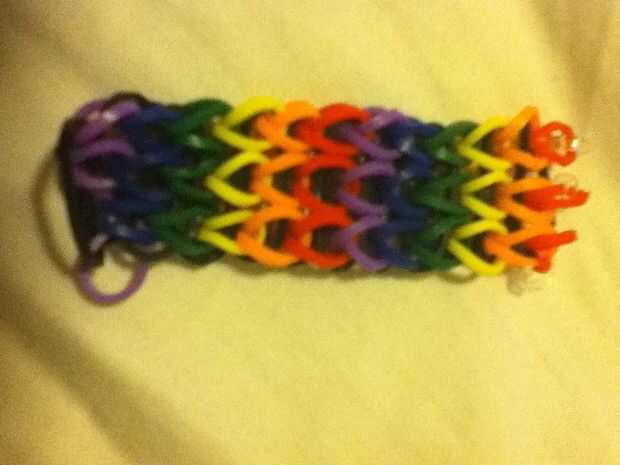 necesita: bandas de un telar del arco iris, un gancho y blanco y negro.Paso 1: Colocación de las bandas Lugar sus bandas en un principio como el triple solo paren en la clavija 4 y mover la banda hacia la derecha y luego haces una línea recta en el c
