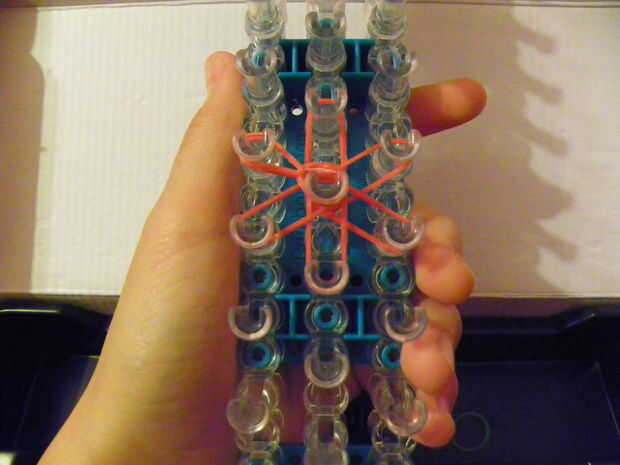 La fresa es todo starburst 'tecnología.' Si no sabes cómo starburst, esto va a ser difícil. De lo contrario, es fácil. A partir de la flecha hacia arriba, empezar con una banda en la fila media subiendo. Luego ir todo y colocar una banda de la tapa en la parte superior hasta que parece como un starburst independiente. Ahora va en la correcta hacia atrás orden, me enganche a todas las bandas de nuevo a sus clavijas originales mientras que la banda de la tapa mantienen en su lugar. Al azar: pido el starburst la pulsera de la ecuación, porque tienes que deshacer en orden inverso. JAJAJA!