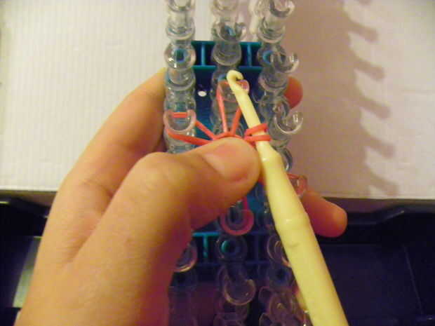 Pulsera única de telar del arco irisPaso 1:Coloque una banda roja en el telar.Paso 2:Luego, colocar una banda amarilla en la dirección opuesta.Paso 3:Continuar ese proceso en el orden del color del arco iris. Pare en el color de rosa.Paso 4:Luego agr
