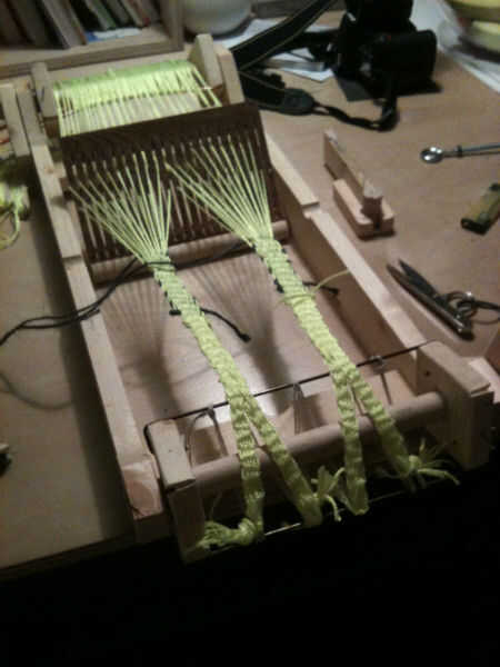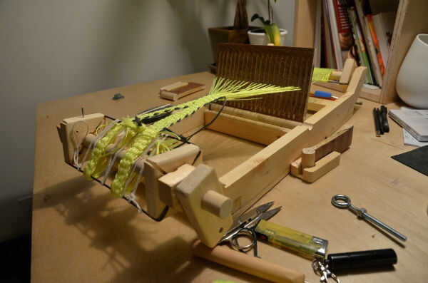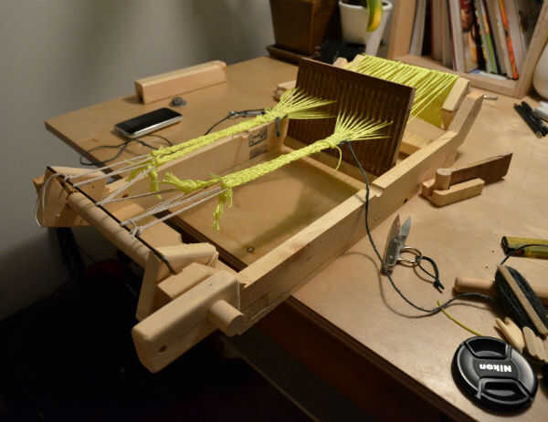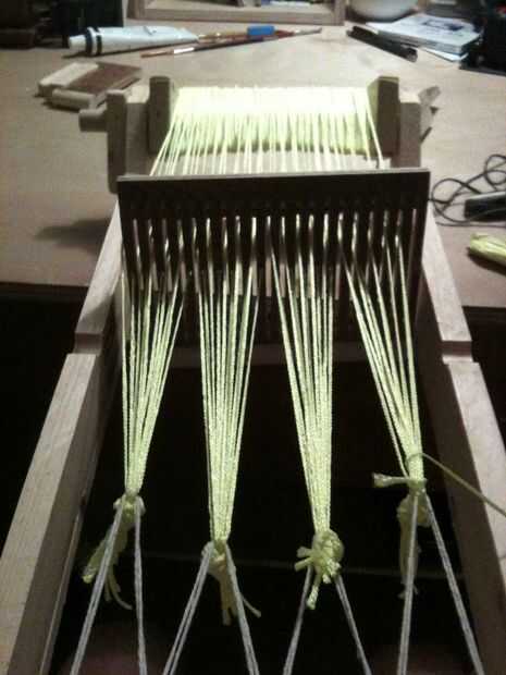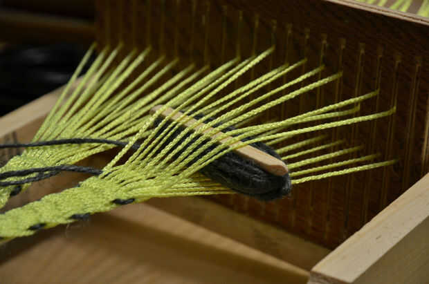 Foto de detalle de cómo la lanzadera (hilado de trama) teje a través de los hilos de urdimbre.