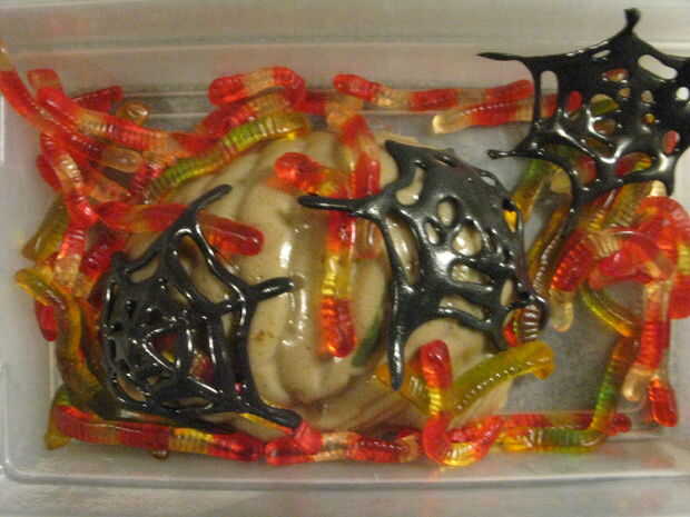 Que para 4-5 horas (mínimo) o durante la noche. Luego colocar en los pasteles, las galletas, utilice como guarnición (hice un cerebro bola de tarta de queso y decorado adorna la bandeja de la porción con estas webs) y en esta foto, decoré un cerebro de gelatina con los gusanos gomosos y telarañas para fiesta de la guardería de mis hijos. Puede hacer diverso tamaño y decorar cualquier tipo de convite de Halloween. O simplemente comerlos solos - saben deliciosas!.