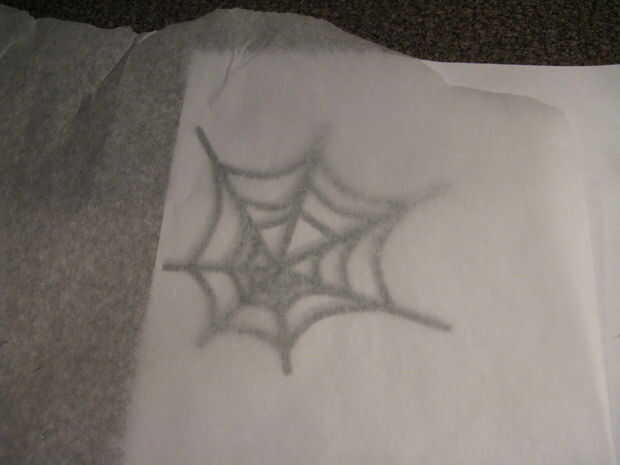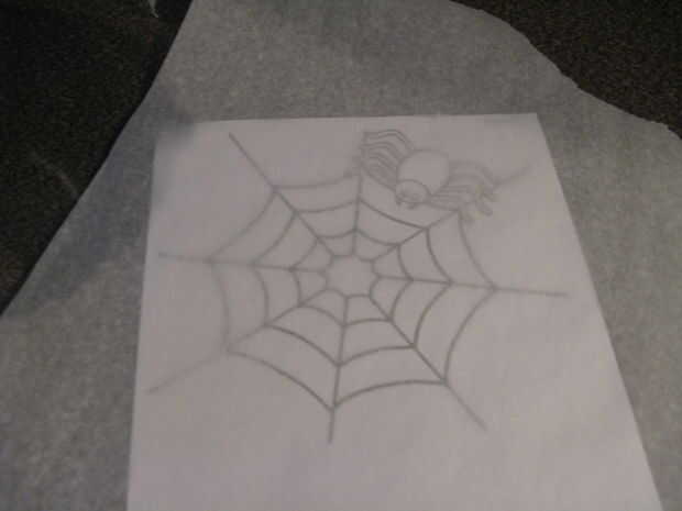 Montar punta y enganche en Manga pastelera y rellenar con la mezcla de comestibles de la web. Coloque una plantilla tela de araña/tela de araña en pergamino (impreso foto de internet y reducido o ampliado, según su preferencia).