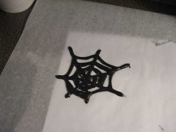 Vierta en la Manga pastelera y utilizando una #2 punta y carefullly tubo webs sobre papel sulfurizado. Esta materia es muy desordenada, así que prepárate! La mezcla se endurecerá como trabajas tan solo tome la punta de la bolsa y el microondas durante 5 segundos y correr agua caliente por la punta hasta que fluye otra vez. Cuando se espese la mezcla en un tazón, sólo microondas por 20 segundos hasta que caliente y suave otra vez.