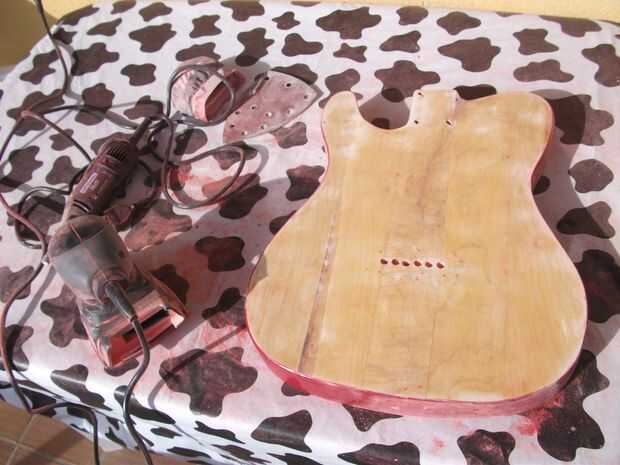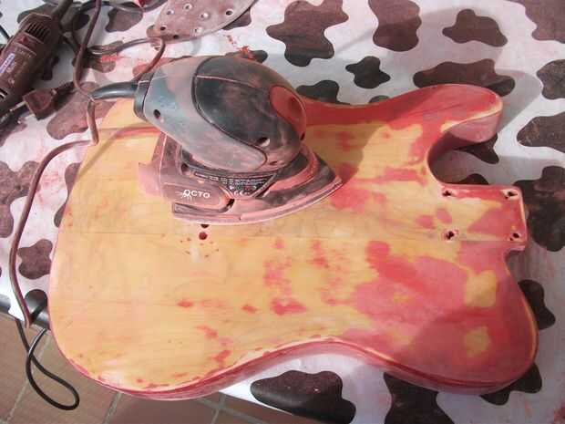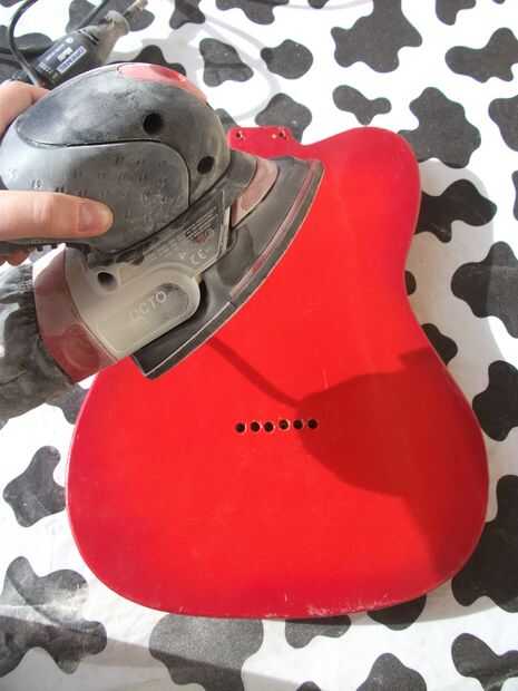 Una vez que el cuerpo de la guitarra, tomar la lijadora y quitar la pintura. En primer lugar quitar la pintura en el área más grande.