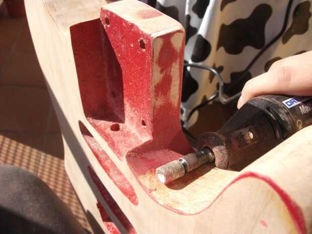 Luego quitar la pintura de los lados. Pero no quite la pintura de los bordes. Esto es lo último que va a hacer. Para trabajar en las partes más inaccesibles, como el lado al lado el traste, puede utilizar una Dremel. Hacerlo con mucho cuidado para no dañar la madera.