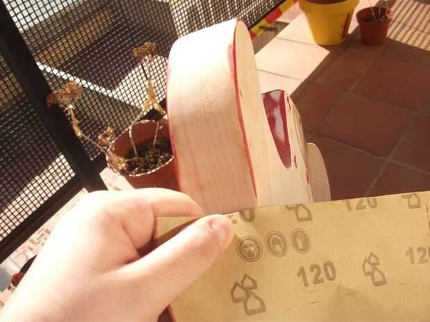 Por último, para quitar la pintura en los bordes, utilicé un papel de lija. Le sugiero que coloque el papel de lija en el borde, tome ambos extremos con la mano y luego muévalo cuidadosamente de lado a lado. De esta manera obtendrás un bonito efecto de "redondeo".