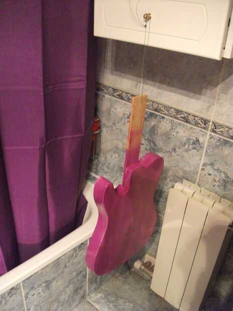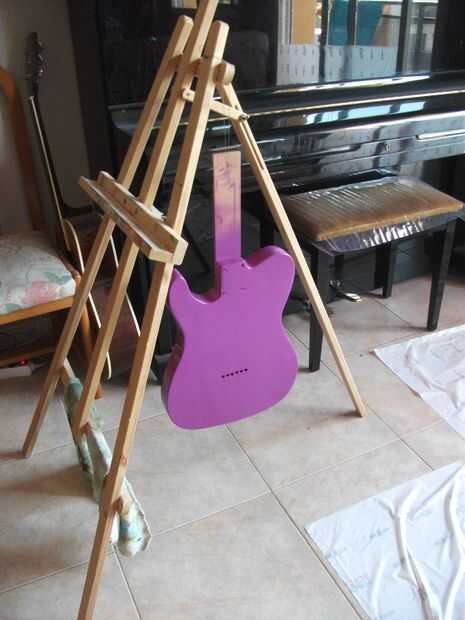 Para dejarlo seco usé un caballete. Fue perfecto porque la guitarra colgado en el centro sin estar en contacto con otras superficies. Se puede colgar en un bloqueo como se puede ver en la segunda foto (esta fue mi primera idea, hasta que encontré mi caballete).