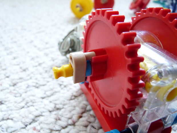 Paso 1: Lo que usted necesita Barras-2 amarillo-2 azul--------------3 ruedas-motores 1-3 anillos azules-1 anillo gris-1 elástico-cuerda (la longitud que usted necesita)-------------CONECTORES-4 blanco-2 gris-3 beigePaso 2: Poner los conectores blanco