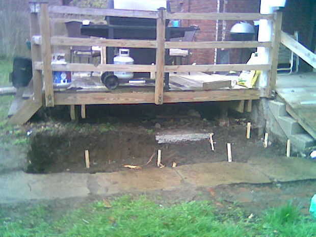 Por lo tanto, comencé excavando el área al lado de la cubierta. Entonces marqué los lugares para unos pies de página construir postes para sostener los rieles.