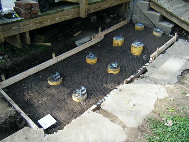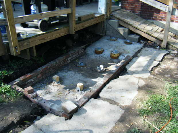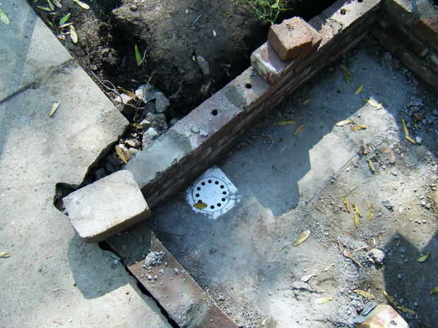 Por lo tanto, yo apoyado en una capa de alambre de malla en la superficie de la tierra, entonces pured en una capa de 2" de concreto como base. He instalado un drenaje en el extremo para evitar que se llena con agua. Entonces yo había encajonado con ladrillo.