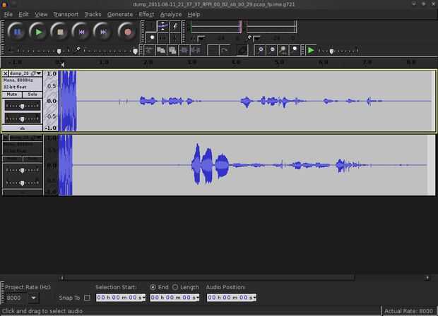 Iniciar audacity a través de "alt + f2" y tipo "audacity" y pulse enter. La parte fija de importación y los archivos de .wav de portátiles-parte de /pentest/telephony/dedected/com-on-air_cs-linux/tools mediante archivo -> Importar -> Audio o simplemente "ctrl + shift + I". Importar los archivos que terminan en. pcap_fp.ima.g721.wav y. pcap_pp.ima.g721.wav.