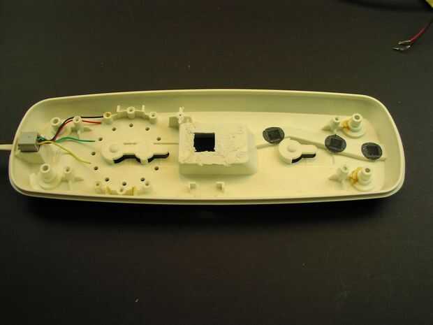 Conectamos la placa a la Junta de pantalla LED con una longitud de un pie de cable PS2. Para permitir que el cable de un camino hacia el cilindro, cortar una pequeña muesca en el lado del teléfono y la base de la caja de LED.