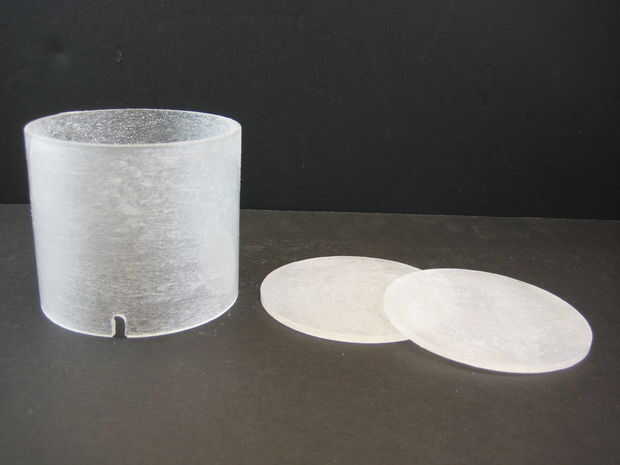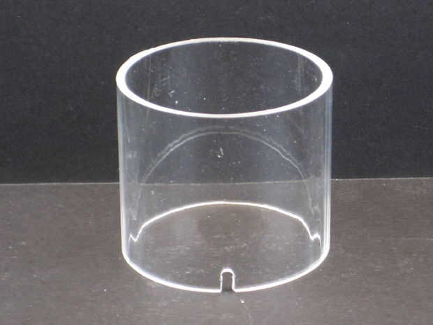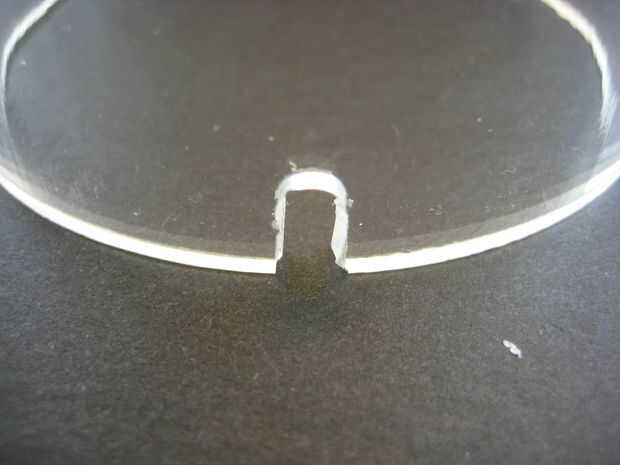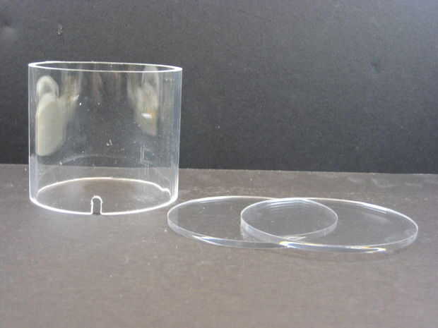 He utilizado un trozo de cilindro de plástico transparente (OD = 3", altura = 2 5/8") y dos discos de plástico para el recinto de exhibición. En orden para el tablero de pc de pantalla interno LED para conectarse a la placa de circuito principal, corté una pequeña muesca en la parte inferior del cilindro para permitir que el cable pase a través. Somos maltratados el interior del cilindro para darle una apariencia blanco lechosa; Esto es para ocultar el tablero de pc de LED y para difundir la luz de los LEDs. El disco superior se une al cilindro de plástico con el cemento solvente acrílico.