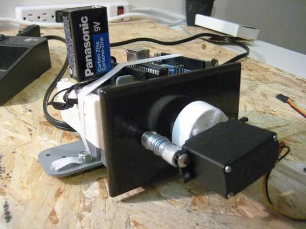 Fijar el servo a la placa de interruptor en cualquier manera que quisiera. Pernos una sección del servo a la placa del interruptor.